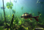 Когда страх ушел, окунек снова приплыл к большой коряге.